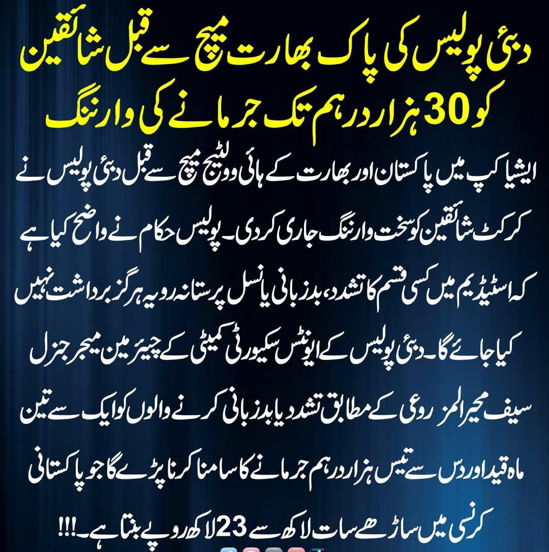 ایشیاء کپ : پاکستان اور بھارت کے مابین ہائی وولٹیج مقابلہ آج شیڈول٬ تماشائیوں کیلئے ہائی الرٹ جاری ٫ لاکھوں کا جرمانہ بھگتنا پڑ سکتا ہے