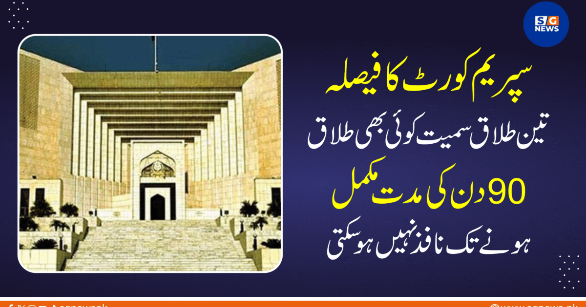 سپریم کورٹ آف پاکستان نے ایک اہم اور دور رس اثرات رکھنے والے فیصلے میں واضح کیا ہے کہ مسلم فیملی لاز آرڈیننس 1961 کی دفعہ 7 کے مطابق تین طلاق سمیت کسی بھی صورت میں دی جانے والی طلاق اُس وقت تک نافذ العمل نہیں ہو سکتی جب تک مقررہ 90 دن کی مدت پوری نہ ہو جائے۔ عدالتِ عظمیٰ نے اس معاملے میں قانون کی تشریح کرتے ہوئے کہا کہ طلاق کا عمل صرف زبانی اعلان سے مکمل تصور نہیں ہوتا، بلکہ اس کے لیے قانونی طور پر نوٹس کا اجرا اور اس کے بعد 90 دن کی مدت کا گزرنا لازم ہے، چاہے طلاق ایک ہو یا تین، یا کسی بھی شکل میں دی گئی ہو۔